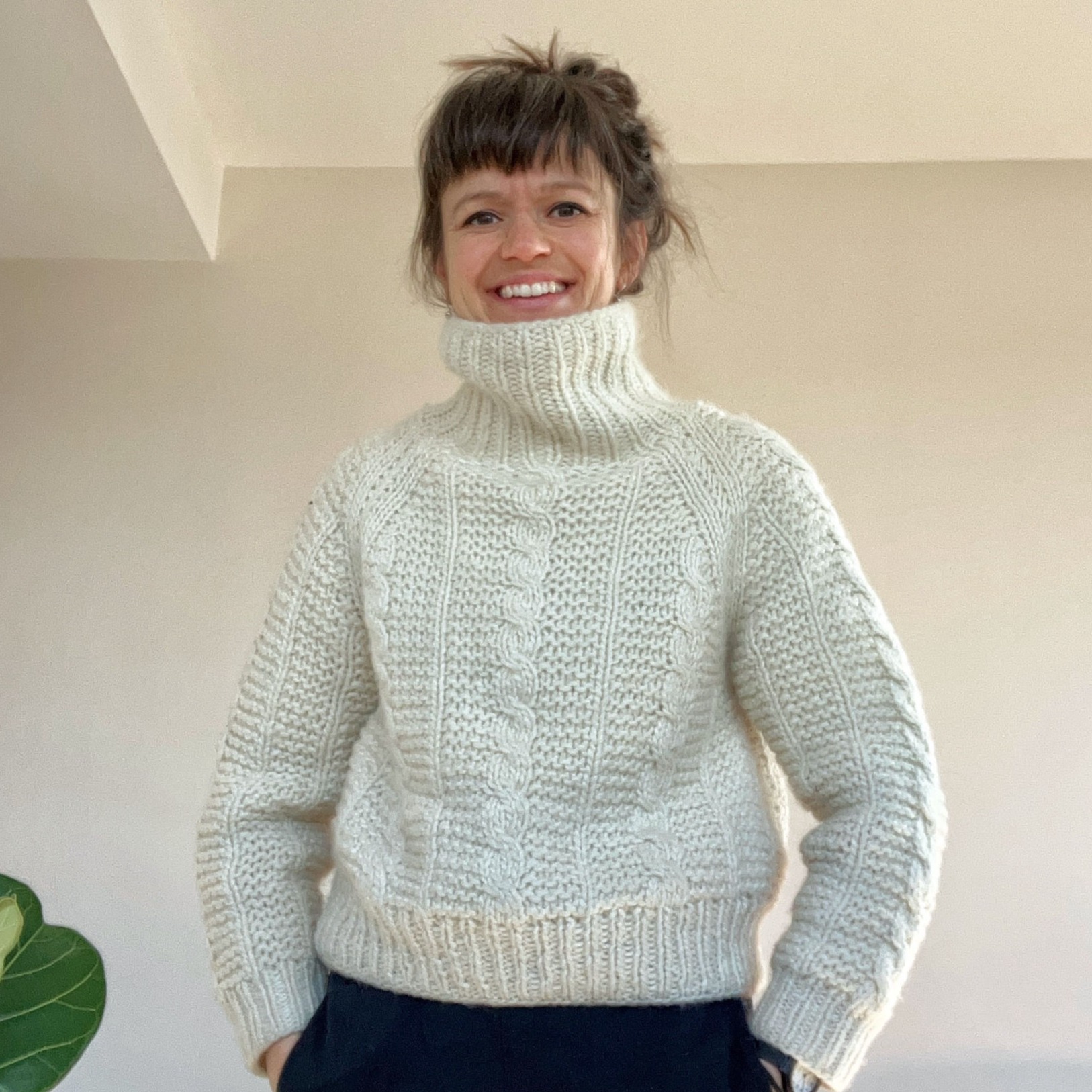 I cut the sleeves and the bottom shorter and undid the side seams to form a boxy shape. I knitted triangle panels to increase the volume at the sides.